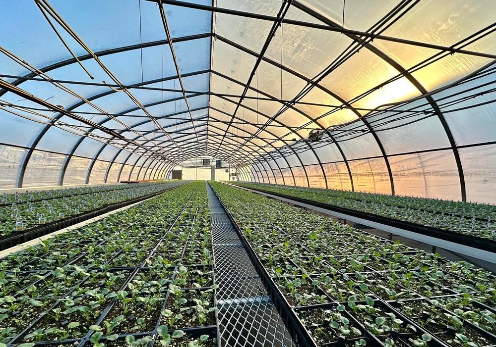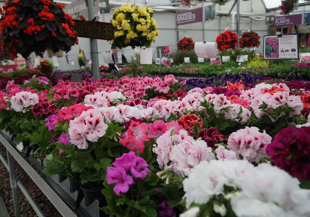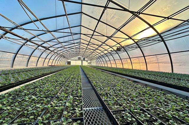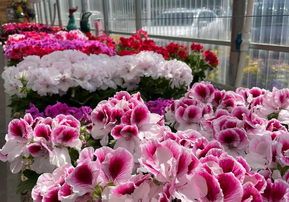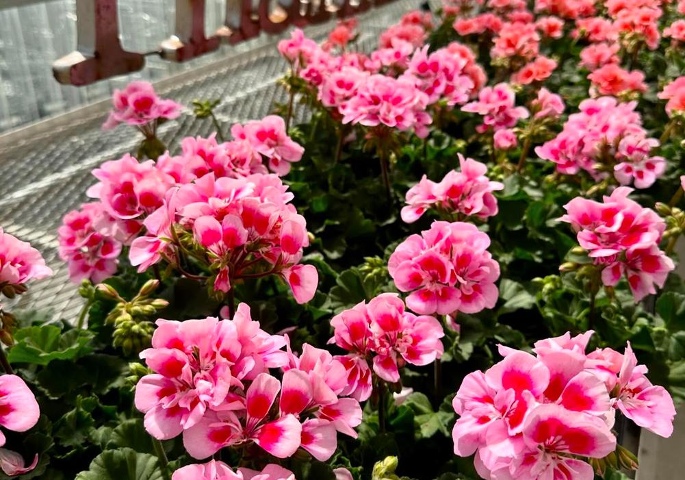 Greenhouse full of seed geraniums at the farm